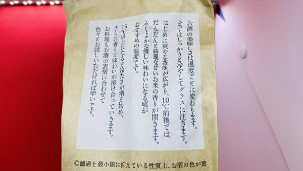 It has a gentle, low-irritation taste, and although there is a slight alcoholic kick on the tongue, it is overall mellow. The dry sake characteristics are not lost, and the combination of green apple, muscat, and plum creates a balanced acidity and sweetness.